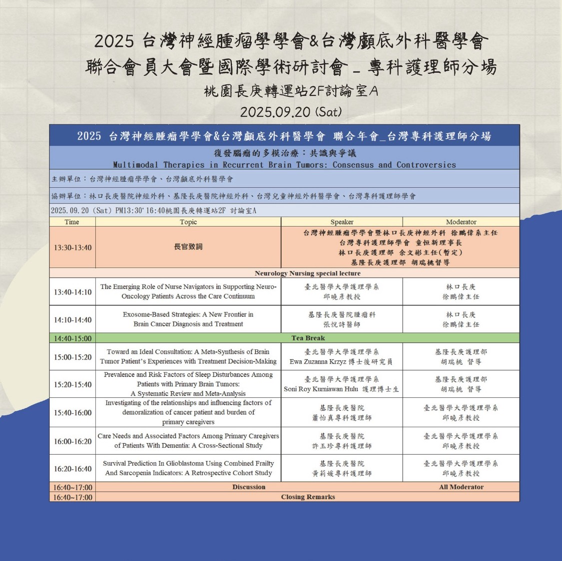 此外,隨著神經腫瘤照護日趨精細化,護理專業扮演著不可或缺的角色。為促進臨床與學術交流,將特別舉辦專科護理師專場,會場為庚國際轉運站2F討論室A(桃園長庚轉運站),本場護理專場特別邀集多位來自臺北醫學大學及長庚的護理與醫學專家,深入探討腦腫瘤患者照護歷程中的多重面向。從導航護理師的新興角色、腦癌與外泌體的關聯性、患者治療決策經驗、睡眠困擾風險因子、失智共病對照顧者負荷的影響,到照顧需求與存活預測因子的探討,期望能激盪出更多臨床實務與研究的創新思維。
