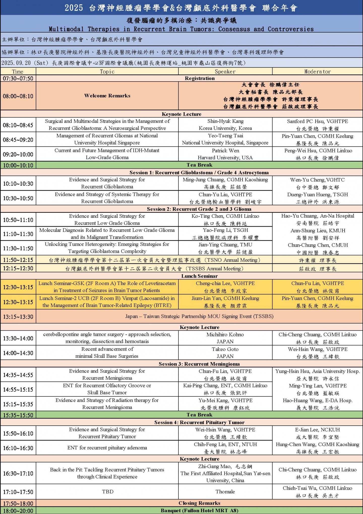 本會訂定114年9月20日(星期六)假 長庚國際轉運站3F國際會議中心(桃園長庚轉運站)舉辦台灣神經腫瘤學學會&台灣顱底外科醫學會聯合年會暨國際學術研討會,會中將邀請國內外專家共聚一堂,針對顱底手術和腦瘤手術以及藥物治療最新概況及趨勢做一系列的演講,會議內容精彩可期,誠摯邀請全體會員踴躍參加,會中除了提供餐點以外,會員報到繳交常年會費必贈送會員紀念品乙份,今年會員紀念品包括摺疊推車及小米手環等相當豐富。