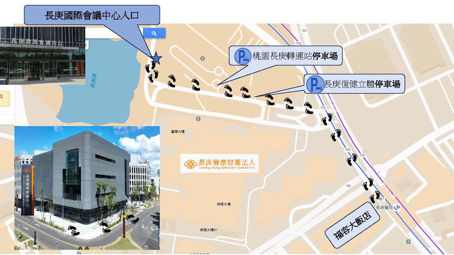 由於桃園長庚轉運站範圍較廣,動線較為複雜,為便利語彙貴賓順利抵達會場,特提供地圖供參考,並建議您由「湖邊路」的入口處進入長庚國際會議中心。